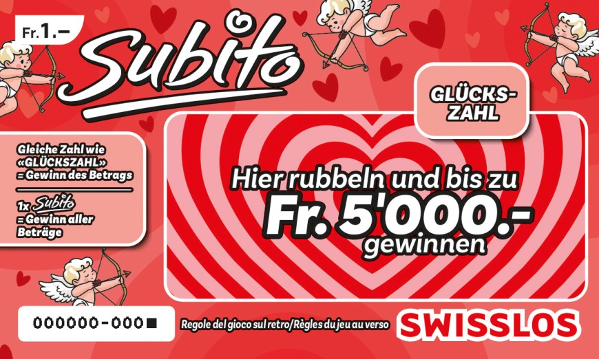 Klein aber oho - unser kleinstes Los bietet Ihnen nicht nur viele verschiedene, spannende Spiele, sondern mit einem Einsatz von nur 1 Franken die Chance auf grosse Gewinne von bis zu 5'000 Franken. Wieso also anstatt des Rückgeldes nicht mal ein «Subito» Los versuchen?